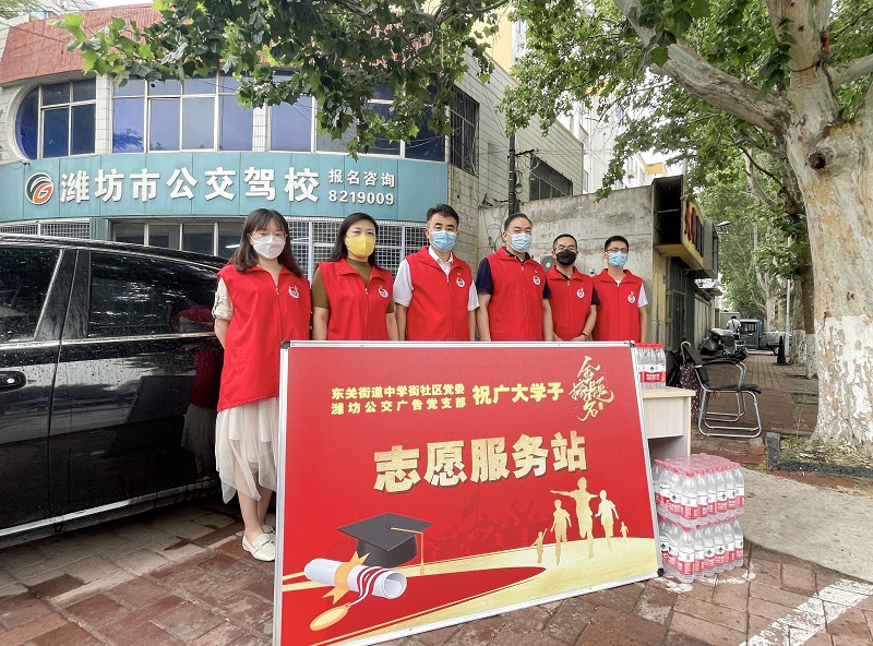 为进一步发挥党员先锋模范作用,广告公司党支部按照集团党委党史学习教育“我为群众办实事”实践活动及“双报到”工作要求,联合东关街道中学街社区,于6月10日下午,在鸢飞路与中学街路口设立“潍坊中学高考点”志愿服务站,组织17名党员提供志愿服务,为高考学子保驾护航。