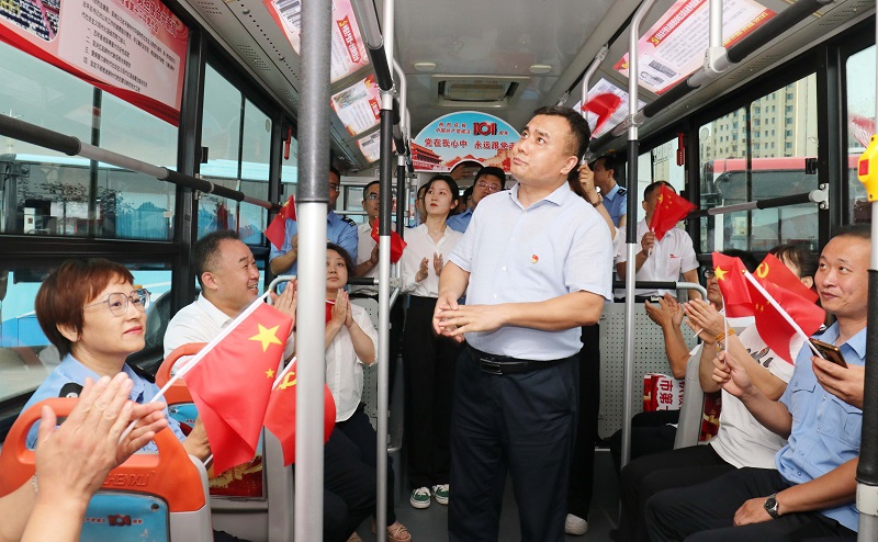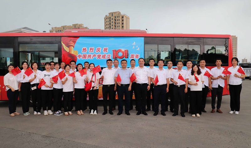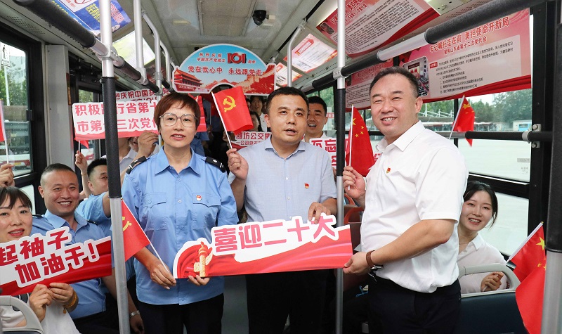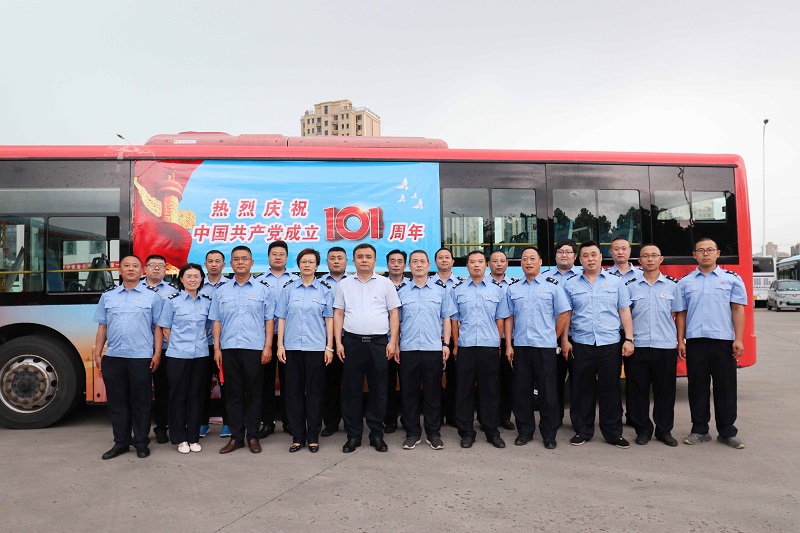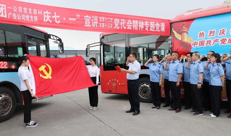 为庆祝建党101周年,公交集团在现有26台党史主题公益宣传公交车的基础上,又打造了9台以“庆祝建党101周年”为主题的公益宣传公交车,35台党建主题的车厢内全部上刊了中共一大到十九大、遵义会议、红军长征等内容的车厢看板和乘客后背板,将公交车厢打造成红色文化宣传阵地。王振刚同志和党员们走进22路红色文化车厢,又为大家讲授了“车厢党课”。带领大家学习回顾了党的一大等光辉历程,要求全体党员要把学习党史、学习贯彻落实省第十二次党代会精神、市第十三次党代会精神作为当前和今后一段时期的重大政治任务,学懂弄通、学思践悟。最后,大家挥动着手中的党旗、国旗和“喜迎二十大”、“撸起袖子加油干”、“不忘初心 牢记使命”等标语牌,共同喊出响亮的口号,表达着庆祝党的生日、喜迎二十大胜利召开的喜悦之情和撸起袖子加油干的信心和决心!