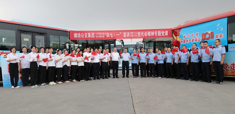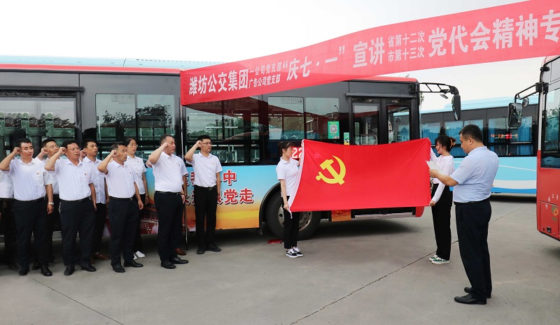 为庆祝建党101周年,深入学习贯彻省第十二次党代会精神、市第十三次党代会精神,6月30日下午在一公司安顺场站,潍坊公交集团一公司党支部和广告公司党支部联合开展“庆七·一”专题党课学习。集团党委书记、董事长、总经理王振刚为全体党员宣讲了《牢记初心使命 砥砺奋进争先 坚定不移推进公交事业高质量创新发展——学习贯彻省第十二次党代会精神、市第十三次党代会精神》。一公司党支部和广告公司党支部共计47名党员,在两台“庆祝建党101周年”公益宣传车体前整齐列队,现场聆听了王振刚同志的党课。