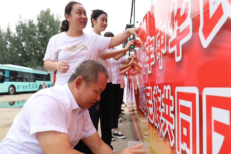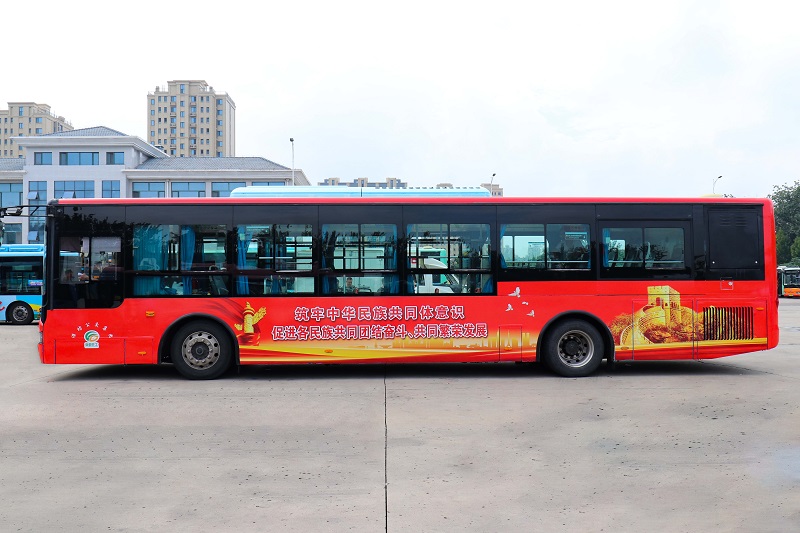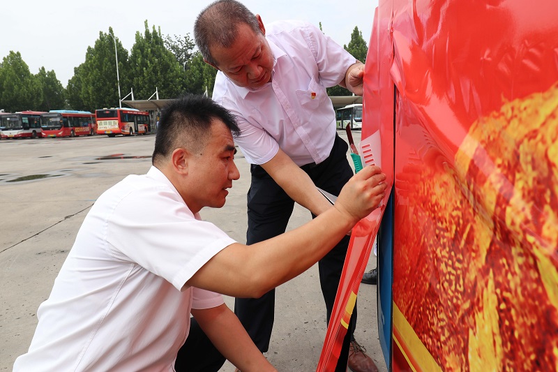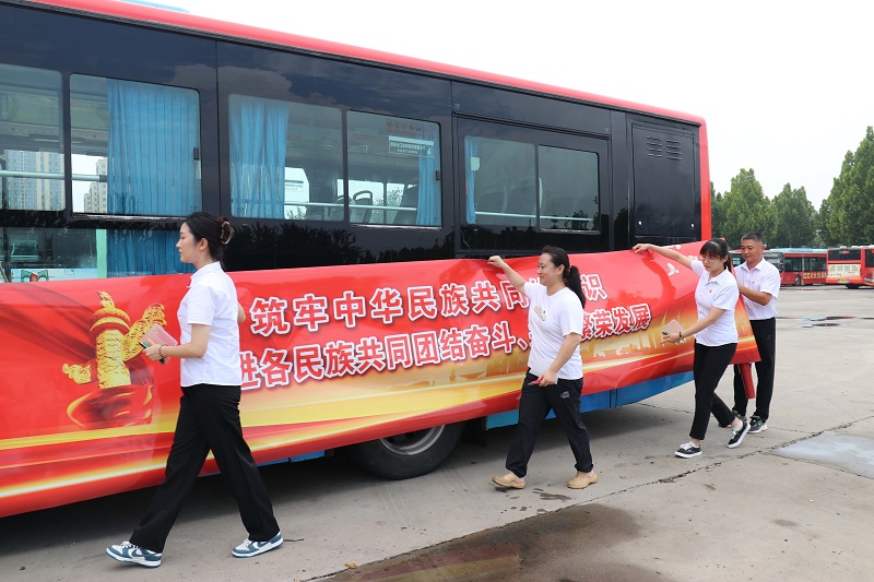 在活动现场,党支部书记为党员们分发了广告发布工具,明确了发布要求。所有党员按照分工清洁车身、张贴画面、裁切修边、精修美化,大家步调一致、各负其责、紧密配合。经过一个多小时的共同努力,一辆以“筑牢中华民族共同体意识 促进各民族共同团结奋斗、共同繁荣发展”为主题的公益宣传公交车呈现在大家面前。红火喜庆、庄重威严的画面鼓舞人心、催人奋进,寄托了大家对国家富强、民族振兴,人民安居乐业的共同美好心愿。