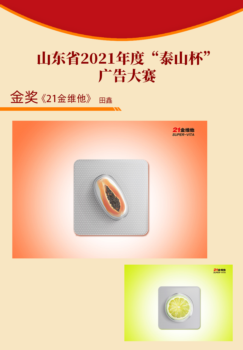 作品利用新鲜的木瓜与柠檬和包装铝板相结合,用鲜亮明快的底色衬托,造成强烈的视觉冲击效果,引人注目。同时也借用夸张的手法表现出了21金维他的产品特性。
