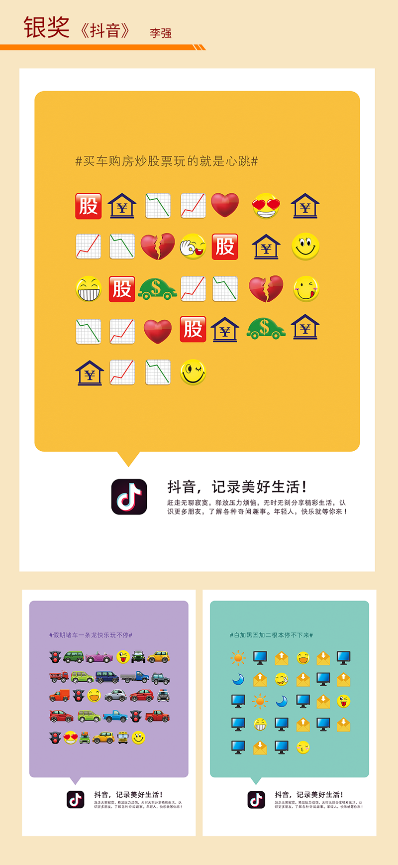 该系列作品体现了当下人们面对的更多的是经济压力、城市拥堵、繁重工作等多重围堵,在使用抖音后的一幅幅笑脸向人们传递出了热爱生活、积极阳光、昂扬向上的生活态度,表达了抖音APP产品对人们生活的善意引导和正向影响的产品特性,凸显了“记录美好生活”的产品功能。