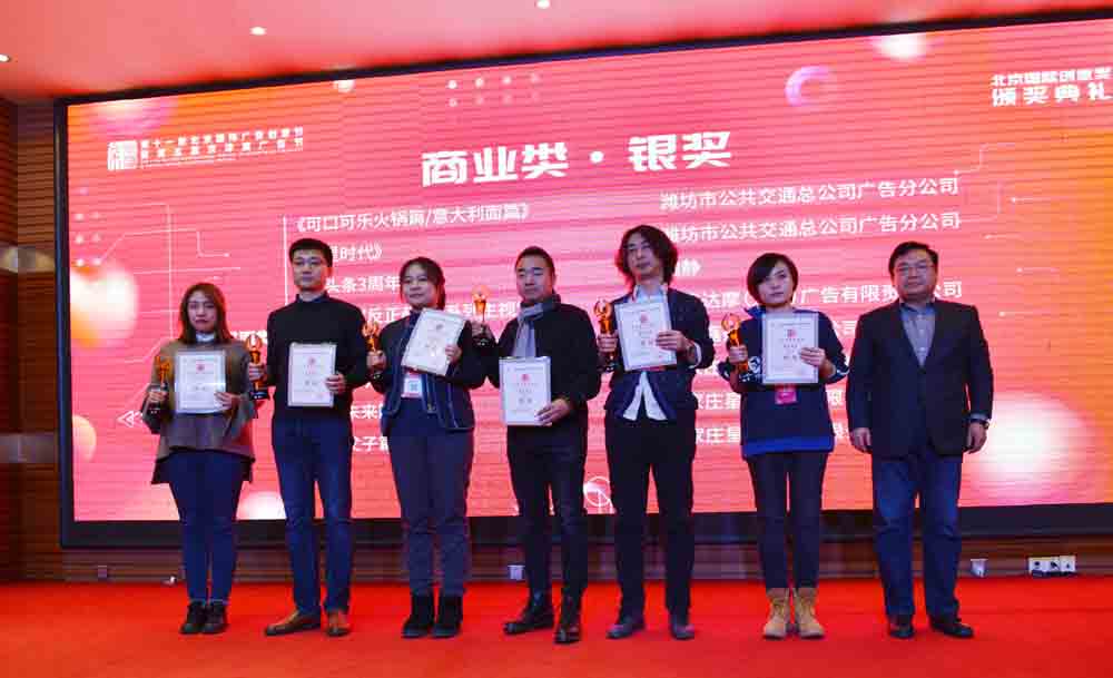 2019年12月20日,潍坊公交广告公司王辉经理带领5名主创设计人员到北京国家广告产业园区参加第十一届北京国际广告创意节,在北京国际创意奖颁奖典礼上荣获1个金奖、5个银奖、13个铜奖的佳绩。